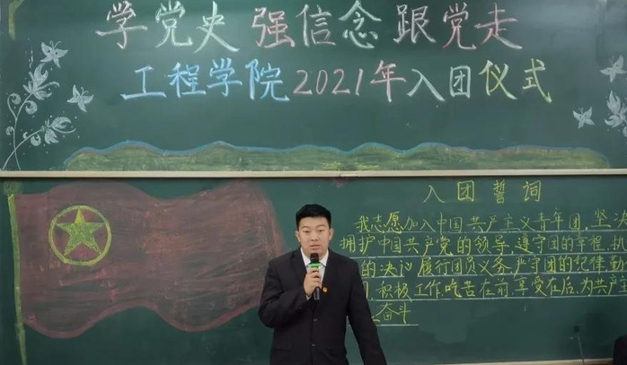 五月花海,为青春绚丽绽放;初夏暖阳,因梦想别具光芒。为加强学院共青团队伍建设,深入开展党史学习教育,引导青年学生重温革命历史、弘扬革命精神、传承红色基因。5月9日,学院开展“学党史、强信念、跟党走”新团员入团仪式,14名新发展团员面对鲜艳的团旗,举起右手庄严宣誓:“我志愿加入中国共产主义青年团……为共产主义事业而奋斗!” 铿锵有力的誓言,道出他们心中的豪情,表达了同学们对共青团组织的无限向往和为团组织增光添彩的豪迈激情。