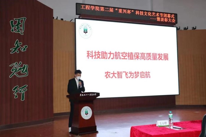 颁奖仪式结束后,由黑龙江省第七届互联网+大学生创新创业大赛金奖获得者“农大智飞”团队负责人丁宝鑫同学代替团队进行路演,并由他的团队也对植保无人机的项目背景、行业前景、产品概述、应用情况等方面进行展示和分享,展现出了我们工程学院学子们勇立改革潮头,勇攀科技高峰的精神风貌!