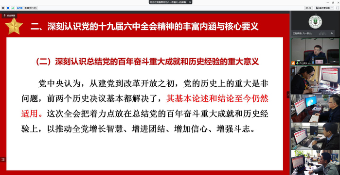12月2日,我院党委理论学习中心组参加学校组织的党的十九届六中全会精神专题讲座。会议采用线上线下相结合方式进行,会议由学校党委书记董广芝主持,学院理论学习中心组成员、党委副书记、院长衣淑娟在主会场参会,其他成员以线上视频形式参会。