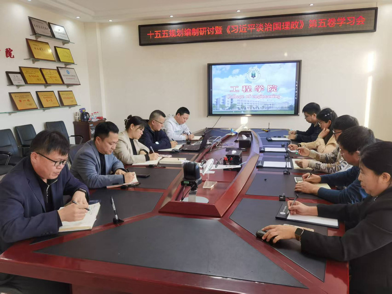 为科学谋划学院未来发展蓝图,以党的创新理论武装头脑、指导实践、推动工作,10月24日下午,工程学院召开了“十五五”规划研讨暨《习近平谈治国理政》第五卷专题学习会。学院领导班子全体成员、各系部中心主任以及教师代表参加学习研讨,会议由学院党委书记姜玉美主持。