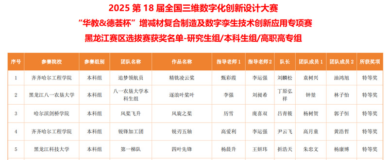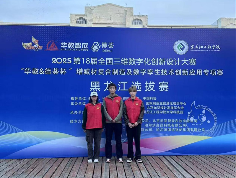 近日,第18届全国全国3D大赛“华教&德荟杯”增减材复合制造及数字孪生技术创新应用专项赛黑龙江赛区选拔赛在黑龙江工程学院落下帷幕。本次大赛以“智创融合・孪生赋能”为主题,由全国三维数字化创新设计大赛组委会、国家制造业信息化培训中心、全国3D技术推广服务与教育培训联盟、北京光华设计发展基金会主办,黑龙江工程学院、哈尔滨市总工会、黑龙江工程学院大学科技园、道外区数字经济示范园区共同承办。来自我省近10所高校的30多支参赛队伍参加比赛。我院参赛队伍凭借扎实的专业能力与创新实践,一举斩获特等奖,并成功突围,作为黑龙江赛区九所入围国赛的院校之一,将代表我省于11月14日至16日赴北京石油化工学院参加全国总决赛。