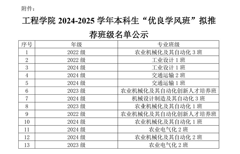 依据《黑龙江八一农垦大学本科生奖励规定》《黑龙江八一农垦大学奖助学金评选及管理办法》,工程学院2024-2025学年本科生“优良学风班”评选工作已经完成班级申报、学院评奖评优领导小组评审等环节,决定拟推荐2022级农业机械化及其自动化3班等13名个班级获得2024-2025学年本科生“优良学风班”,现向全院师生公示,详细名单见附件。
