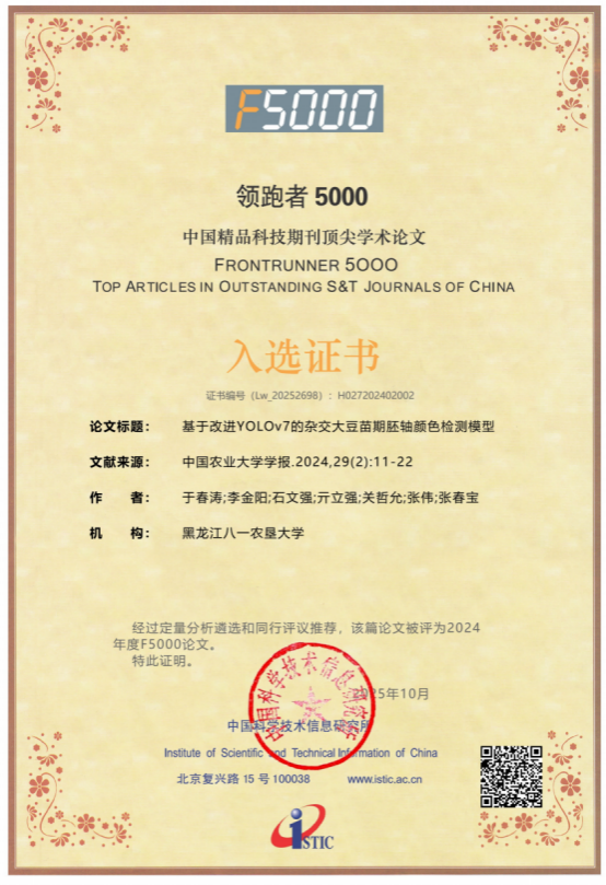 近日,工程学院张伟教授团队与吉林省农业科学院大豆研究所张春宝研究员团队合作,刊于中国农业大学学报的论文《基于改进YOLOv7的杂交大豆苗期胚轴颜色检测模型》,入选2024年度“领跑者5000——中国精品科技期刊顶尖学术论文(F5000)”。
