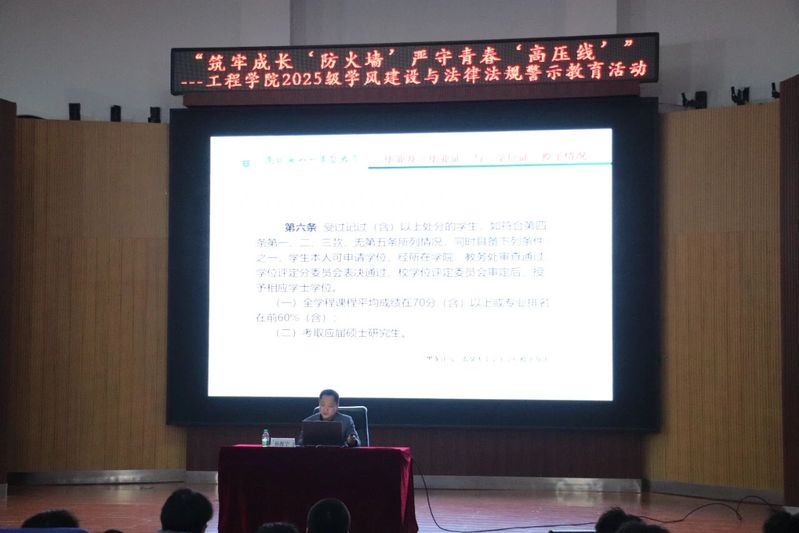 为强化 2025 级新生纪律意识与法治观念,扎实推进学院学风建设,11月26日,学院开展2025级学风建设与法律法规警示讲座,讲座由学院党委副书记孙海宁主讲,2025级全体新生参会。