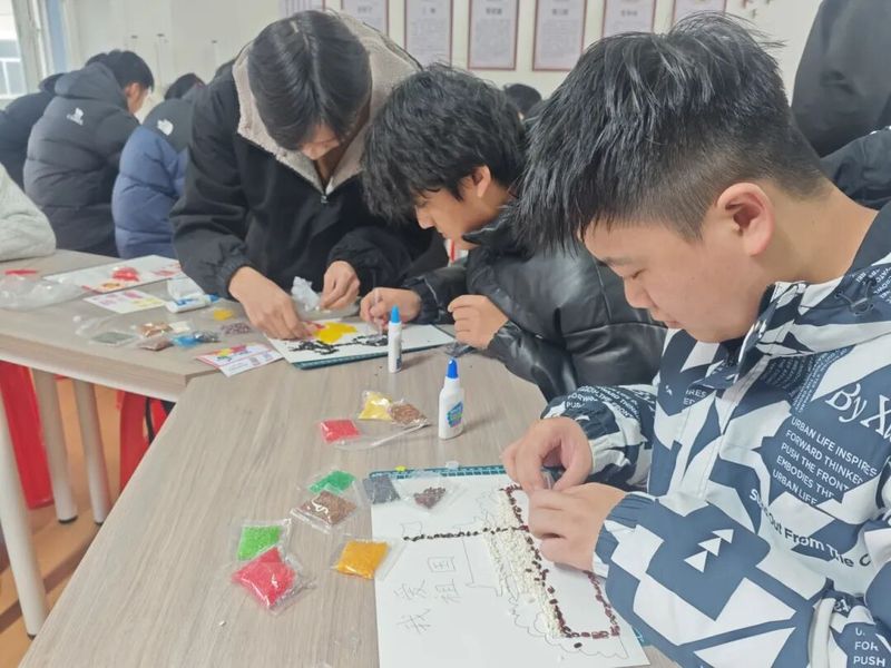 观影结束后,手工创作环节正式开启,各创作区域前都围满了踊跃参与的学生,创意与热情在互动中不断迸发。剪纸区的同学们手持剪刀,在红纸上游刃有余地勾勒出“强国有我”“青春向党”等字样,将爱国情怀融入精巧剪裁;拓印区的同学们通过传统拓印技艺,将红色印记复刻在宣纸上,感受传统文化与红色精神的碰撞融合;拼豆区中,学生们耐心拼接彩色豆粒,组合成“初心”“使命”“90周年”等主题造型,在专注创作中舒缓压力;杂粮画区域学生们巧用各色杂粮,以胶水为媒,在指尖下化作生动的红色图景。