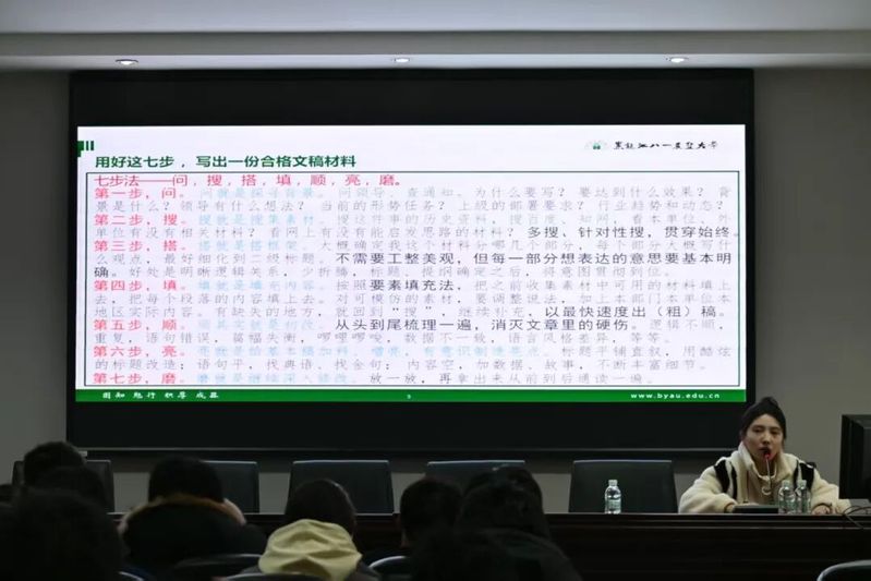本次培训班课程设计科学,循序渐进。培训从基础技能入手,石磊首先开展办公软件专题培训;王小婷聚焦学生活动策划流程并系统解读《学生骨干培养指导手册》;孙浩楠则围绕“学生骨干应具备的基本素养及工作方法”和“文明礼仪与友好沟通”两个专题开展指导;张欣欣则结合宣传工作需要,进行了新闻写作专项培训。