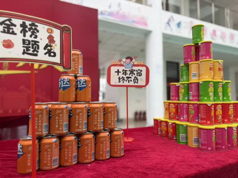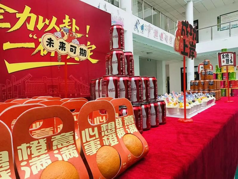 活动现场温馨洋溢,寄托美好寓意的“加油礼”依次排开:蛋糕象征“步步高升”,祝福学业精进、前程锦绣;可乐寓意“百事可乐”,愿未来之路顺利圆满;芬达谐音“分分必拿”,激励学子稳扎稳打、颗粒归仓;橙子代表“心想事成”,期盼努力皆得回报、梦想熠熠生辉。每一份礼物都承载着学院对学子细致入微的关爱与期盼。