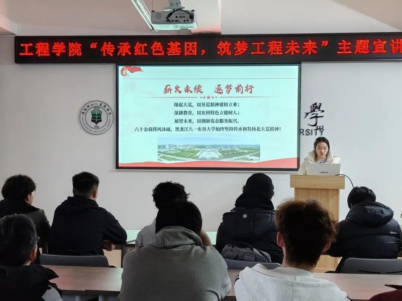 宣讲现场,主讲人围绕黑龙江八一农垦大学六十余载的发展征程徐徐展开。从1958年在十万复转军人开发北大荒的浪潮中应运而生,王震将军亲任首任校长、以“红透专深”为初心指引,到艰苦创业年代师生“边建校、边学习、边生产”的拓荒岁月;从历经体制调整仍坚韧前行,到2003年毅然迁校大庆开启二次创业的壮阔实践,再到如今成为服务国家乡村振兴与农业现代化的重要高校,一个个鲜活的历史片段、一段段感人的奋斗故事,让在场的工程学子深刻感受到学校“困知勉行、积厚成器”的校训内涵与“唯实、坚韧、团结、创新”的校风传承。