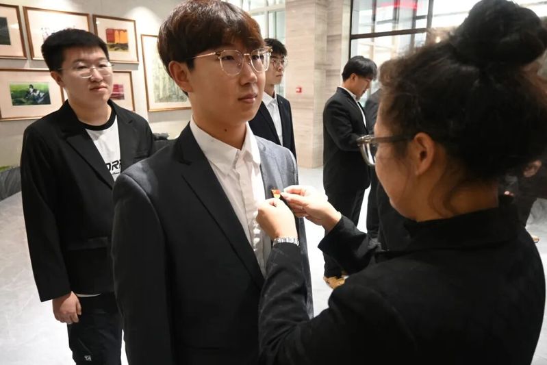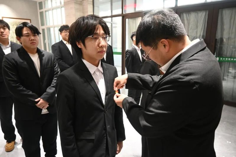 宣誓完毕后,王小婷、孙浩楠、田宛鑫为预备党员佩戴党徽,并勉励大家要时刻牢记入党誓词,践行党的宗旨,在今后的学习、工作和生活中,充分发挥先锋模范作用,将个人成长融入国家发展和学院建设的宏伟事业中,努力成长为堪当民族复兴大任的时代新人。