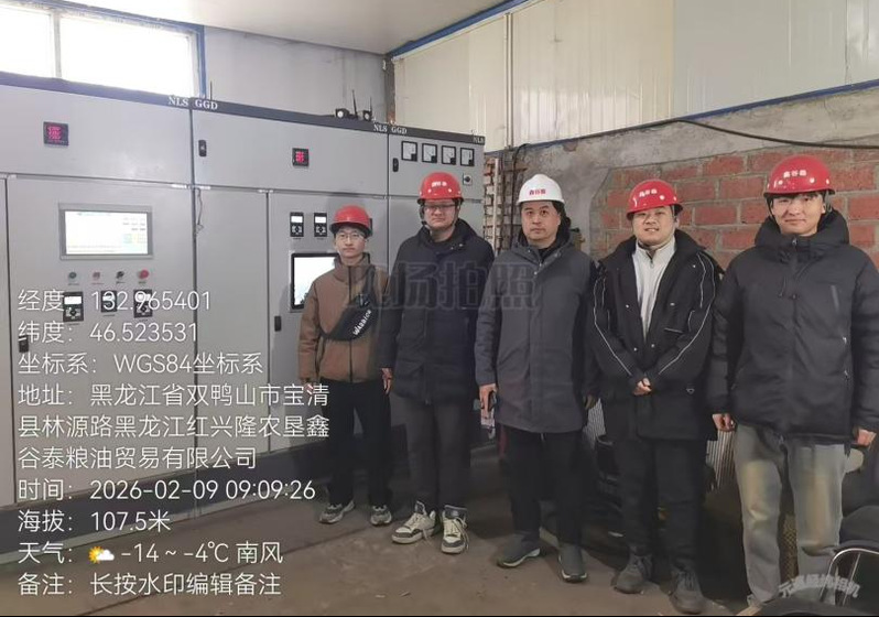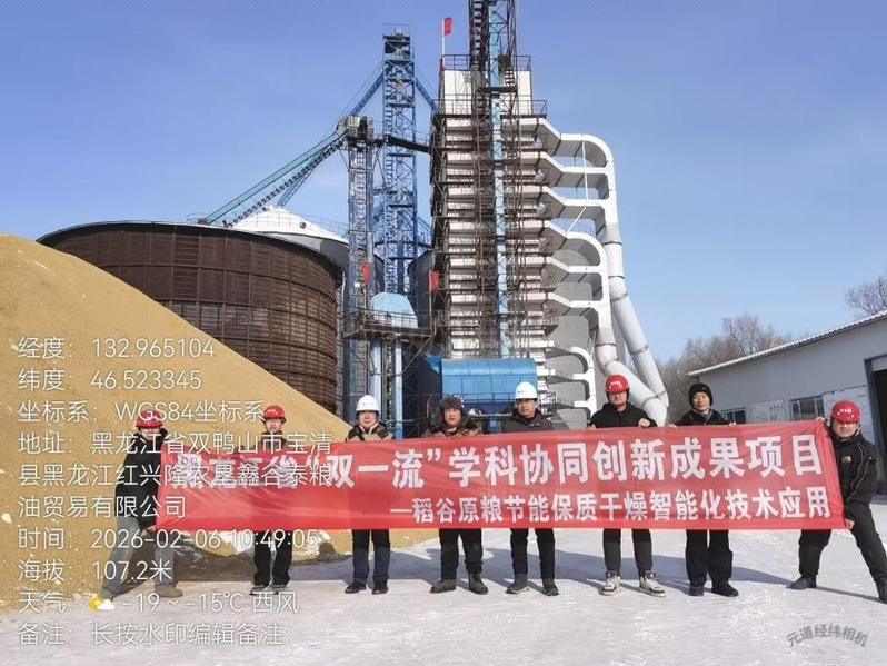 数九寒天,热汽蒸腾。2026年2月1日-2月11日,黑龙江八一农垦大学车刚教授团队在北大荒农垦集团八五三农场工业园区红兴隆农垦鑫谷泰粮油贸易有限公司开展实施了黑龙江省“双一流”学科协同创新成果项目“稻谷原粮节能保质干燥智能化技术应用”的落地生产运营。在黑龙江省东北部严寒条件下实现稻谷原粮保质干燥生产13760余吨,后由北大荒米业八五四农场制米公司临储加工。经过中国农业机械科学研究院国家食品机械质量检验检测中心曹有福总工等数名专业人员现场对比生产检验得出,智能化干燥机较比米业其他干燥机节电约20%,节约燃料达到15.2%,同比单位能耗下降约13%,综合节能17%以上。稻谷干燥不均匀度0.63%,爆腰增值率0.57%,破碎率增值0.32%,节粮减损率1.64%。